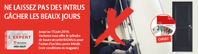 Jusqu’au 15 juin 2019, HANGIST votre serrurier agréé l'Expert Vachette à Paris vous offre le cylindre de haute sécurité RADIALis pour l’achat d’un bloc-porte blindé Vachette.